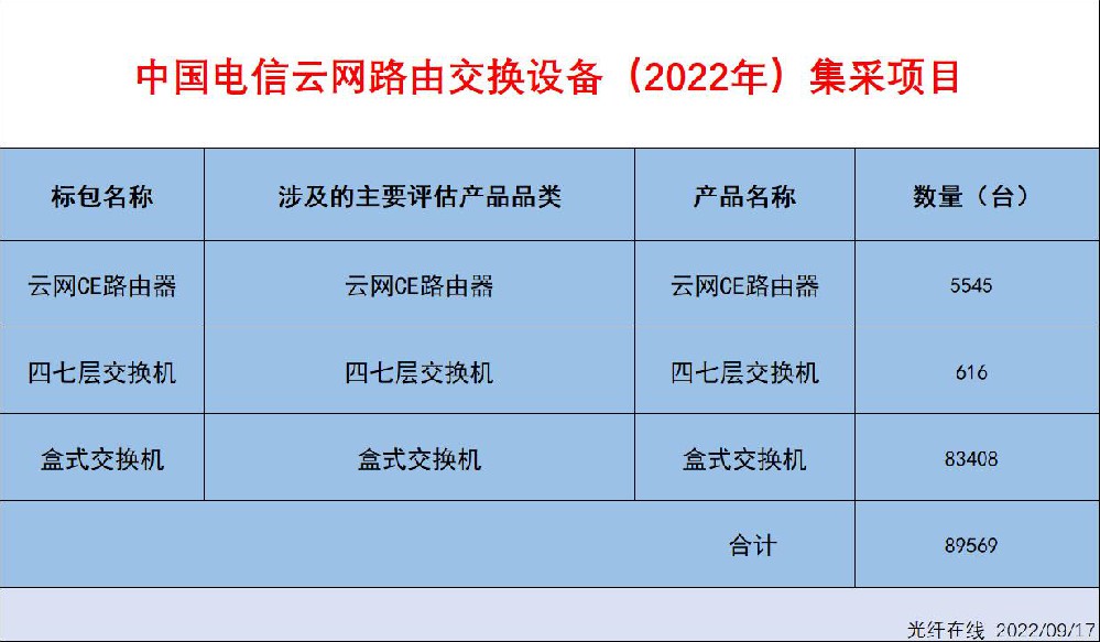中国电信拟采购约89569台云网路由交换设备(2022年)